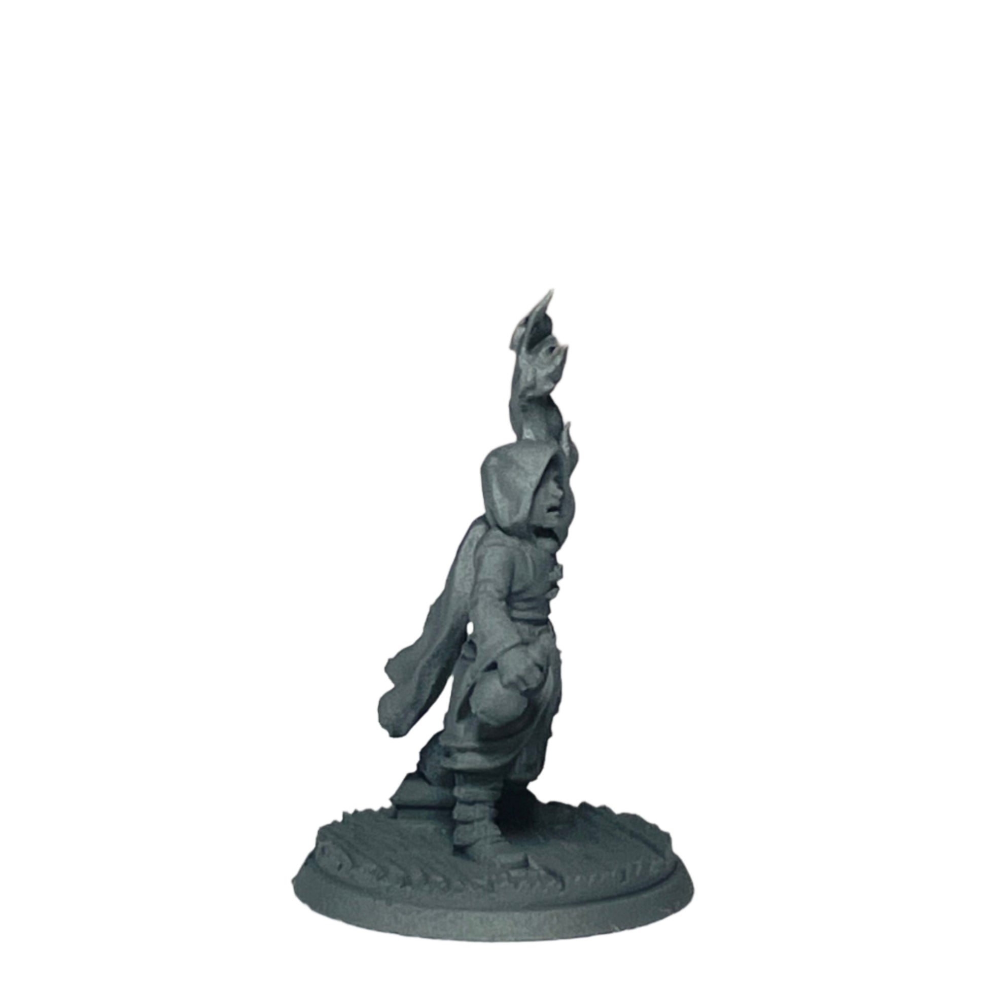 TitanCraft 28mm scale male halfling wielding potion and flame. Primed and ready to paint. Digital File not included. Designed by Titancraft. Miniature made by Warhold.