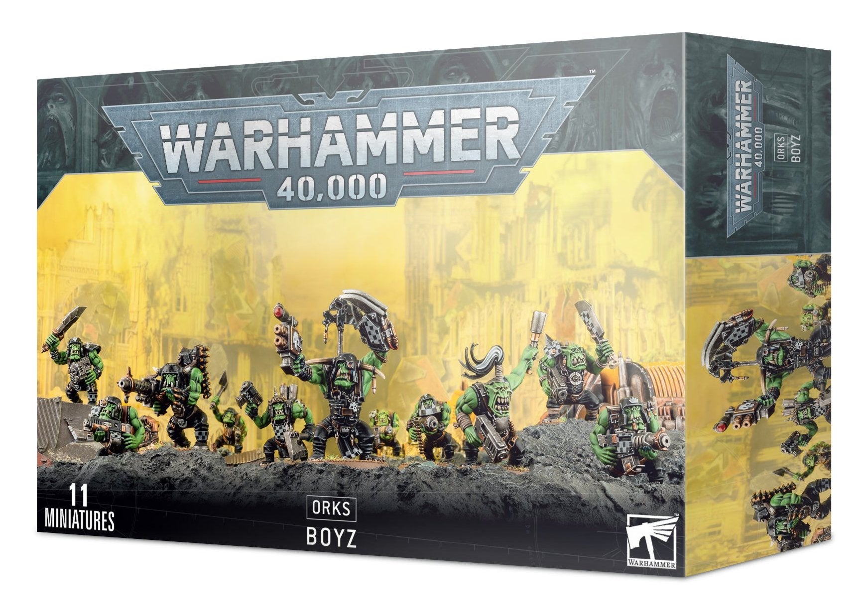 This boxed set contains 11 multi-part plastic Ork Boyz, and includes options for sluggas, choppas, shootas, heavy weapons and stikk bombz. Models supplied with 32 mm round bases.
